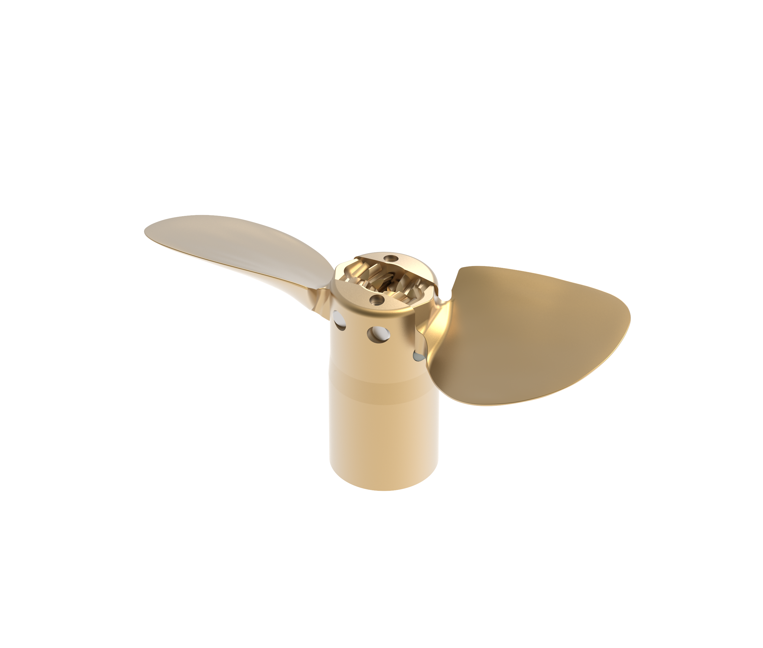 This folding propeller expands when the pod drive is powered in forward or reverse but folds back when under sail to greatly reduce propeller drag.