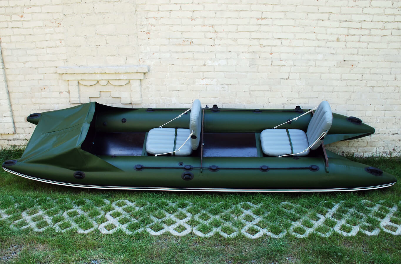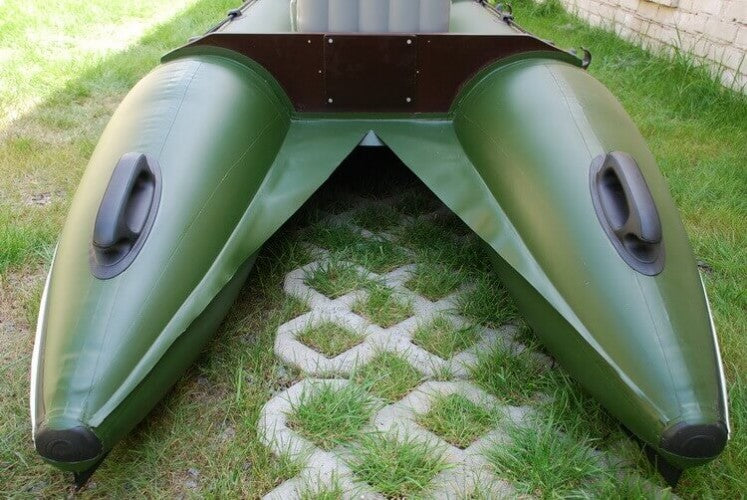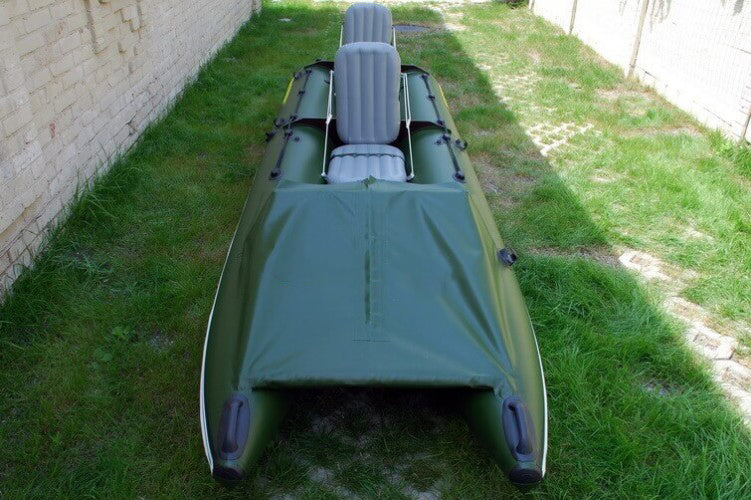 Inflatable Boat Pontoon Catamaran BoatHouse SP350 has been designed for fishing, spearfishing, and travel, including those of increased difficulty. When creating this design, all the advantages and disadvantages of the frame, inflatable, and frame-inflatable kayaks, inflatable boats, and catamarans were deeply studied and taken into account. Thanks to this, the SP transom kayaks received a catamaran structure with one-piece hydrodynamic cylinders, divided in half by a membrane. This design creates the least resistance when moving, does not roll over, is unsinkable in principle, and is very passable. Why was SP classified as a catamaran? Because their width is 116 cm, and due to their high landing, they are perfect for rowing with catamaran oars, 240 cm long. Additionally, you can install ordinary oars on oarlocks, but the shortest ones.