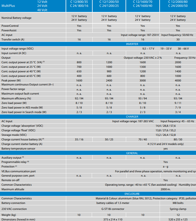 The MultiPlus, as the name suggests, is a combined inverter and charger in one elegant package. Its many features include a true sine wave inverter, adaptive charging, hybrid PowerAssist technology, plus multiple system integration features.
