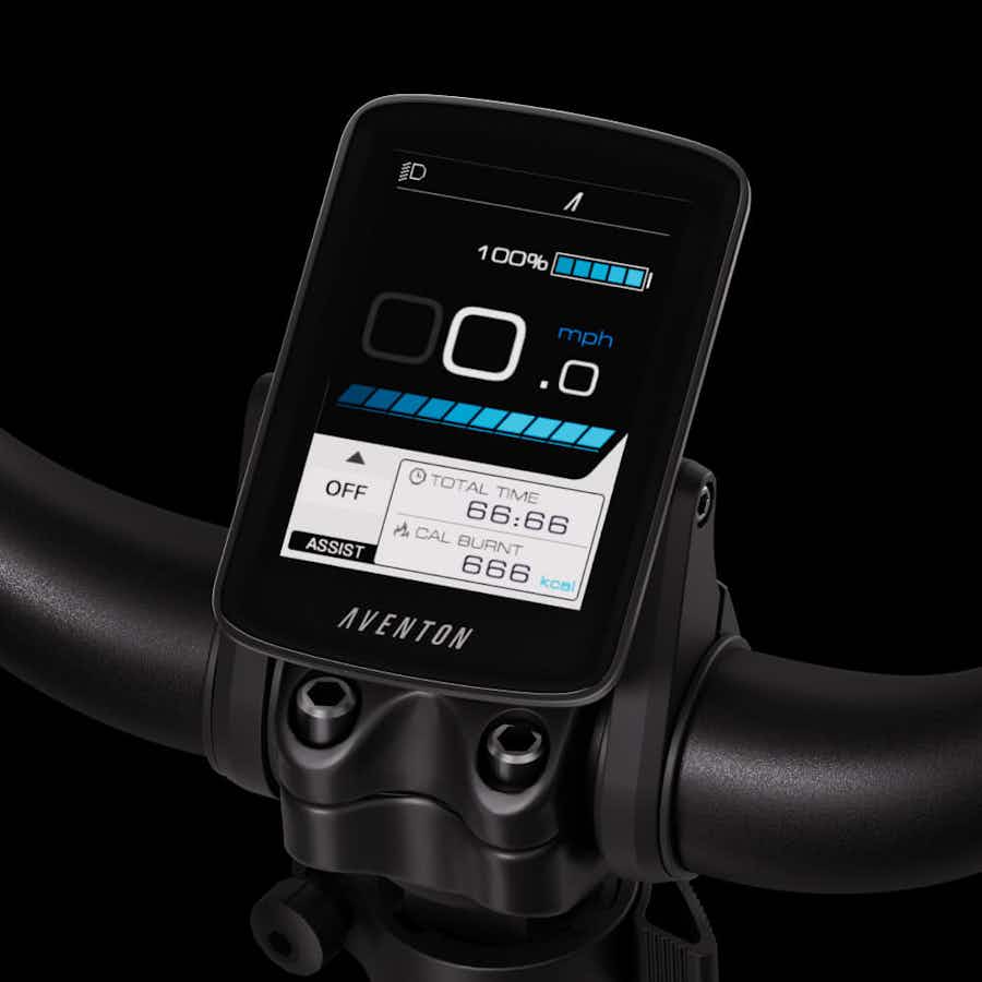 Get real-time metrics such as speed, battery life and pedal assist level with the Full Color Display. Plus, charge your smartphone with the concealed USB port and sync to the Aventon app to connect to the larger Aventon community and share info and goals.