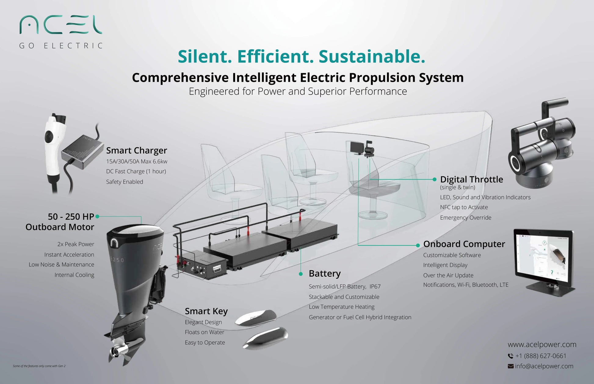 Acel Power Inc. electric outboard engines are silent, zero emissions during operation and instant torque. Low maintenance, high lifespan.