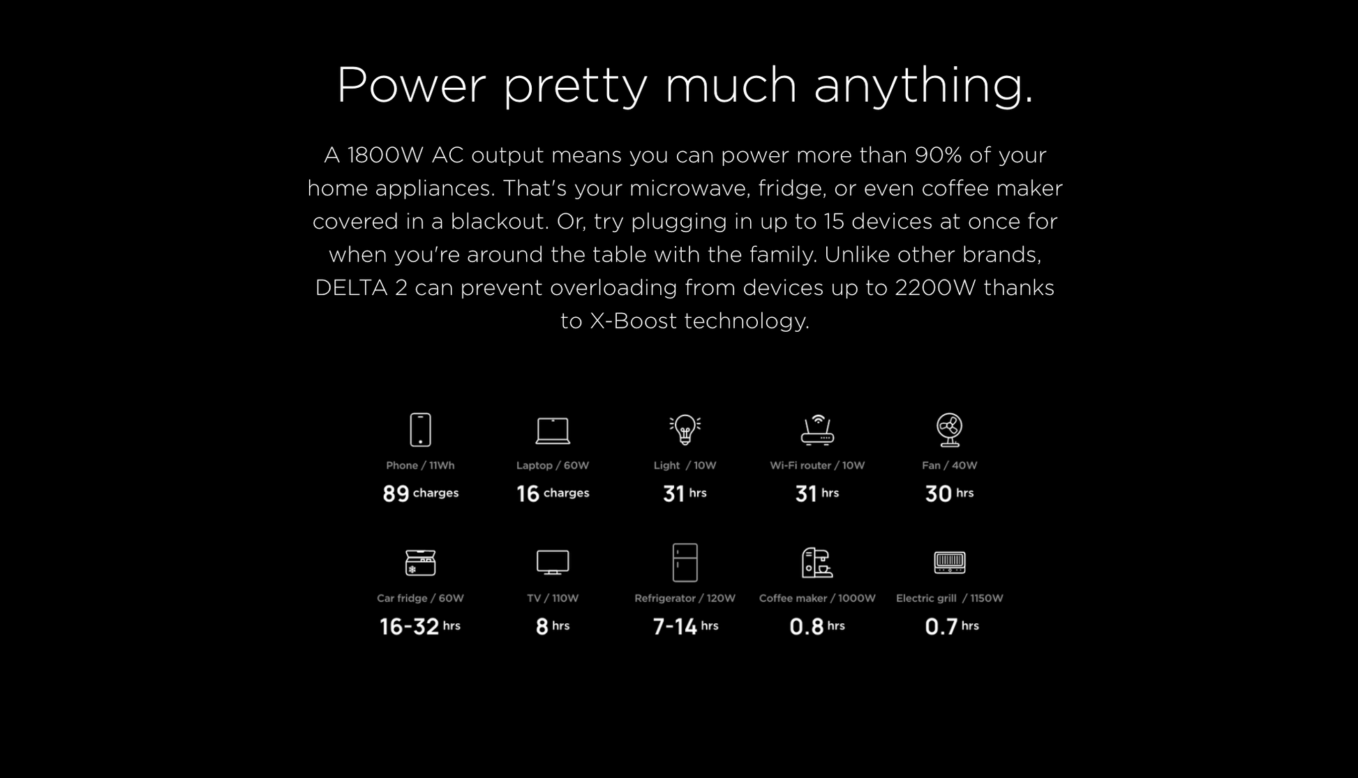 - Huge AC output - 1800W AC output means you can power more than 90% of your home appliances. Or, try plugging in up to 15 devices at once. Unlike other brands, DELTA 2 can prevent overloading from devices up to 2200W thanks to X-Boost technology.