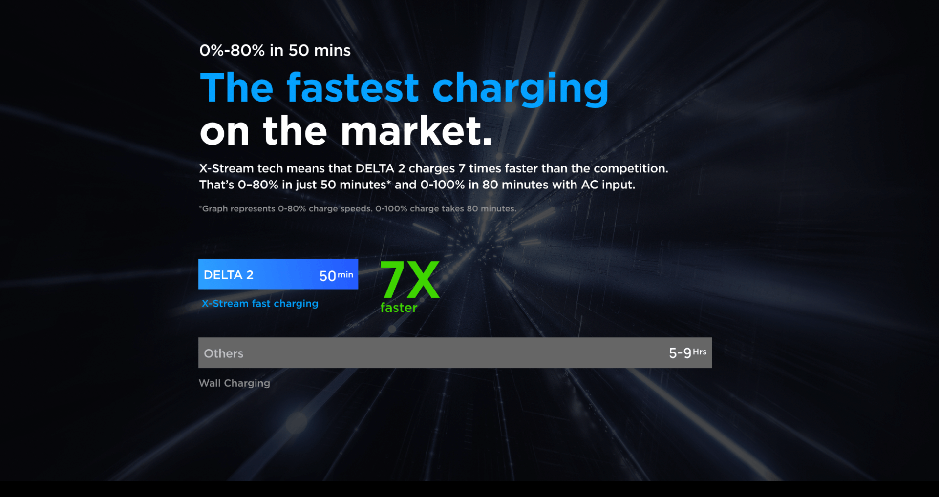 - 7x Faster AC charging - X-Stream tech means that DELTA 2 charges 7 times faster than the competition. That’s 0–80% in just 50 minutes and 0-100% in 80 minutes with AC input.