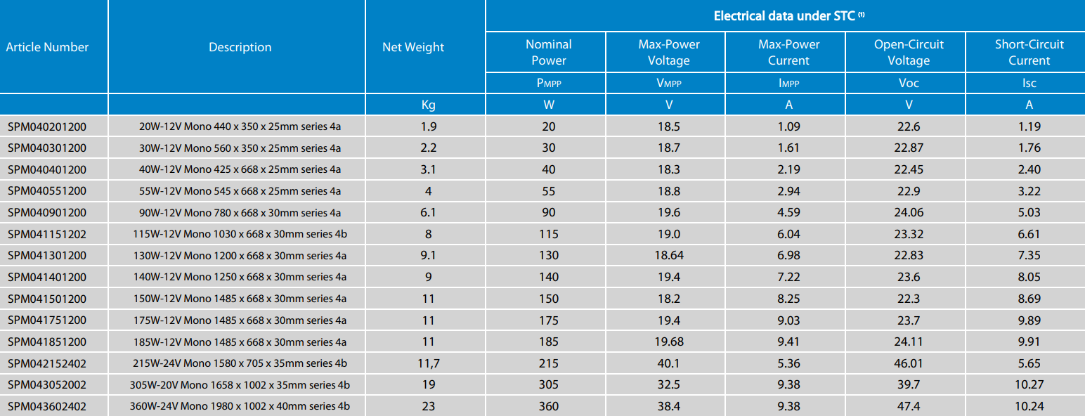 Victron BlueSolar Monocrystalline panels are manufactured to the same high standards of all Victron equipment. The BlueSolar panels are designed to provide power to off-grid, domestic, motorhomes and boat systems, providing great performance in low-light and minimizing losses in shaded areas. The panels range from 30 watts up to 340 watts.
